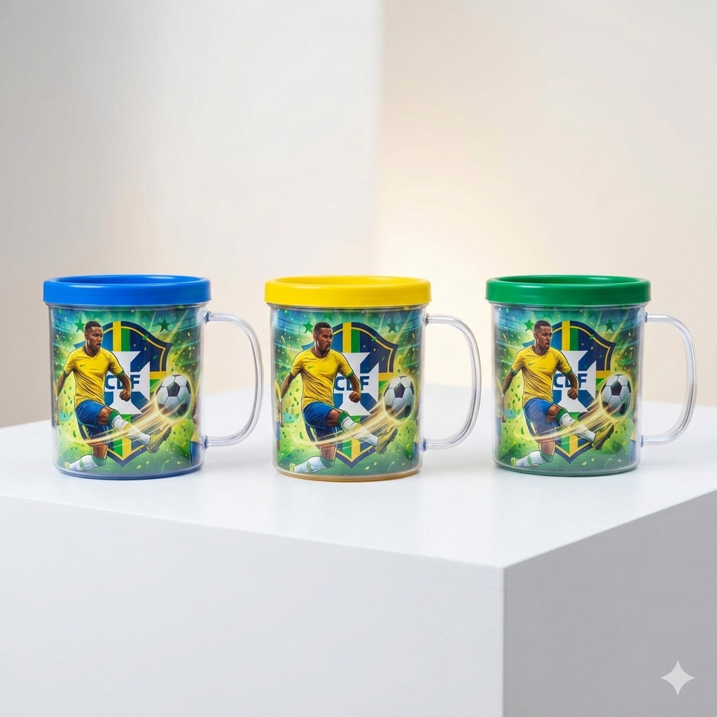 As canecas possuem estampa exclusiva inspirada no futebol, com visual moderno e cores vibrantes que remetem à torcida brasileira. Um item que chama atenção, agrega valor e combina com festas, eventos, churrascos, reuniões entre amigos e comemorações esportivas.